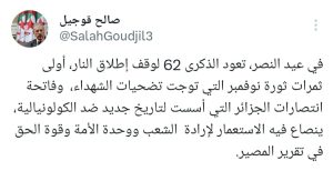 « En cette Fête de la Victoire, nous célébrons le 62e anniversaire du cessez-le-feu, premier fruit des sacrifices des Chouhada durant la Révolution de Novembre, marquant le début des victoires de l’Algérie et une nouvelle page de son histoire contre le colonialisme, où le peuple, par sa volonté, son unité et son attachement à son autodétermination, a triomphé du colonisateur », écrit M. Goudjil sur son compte officiel sur les réseaux sociaux.