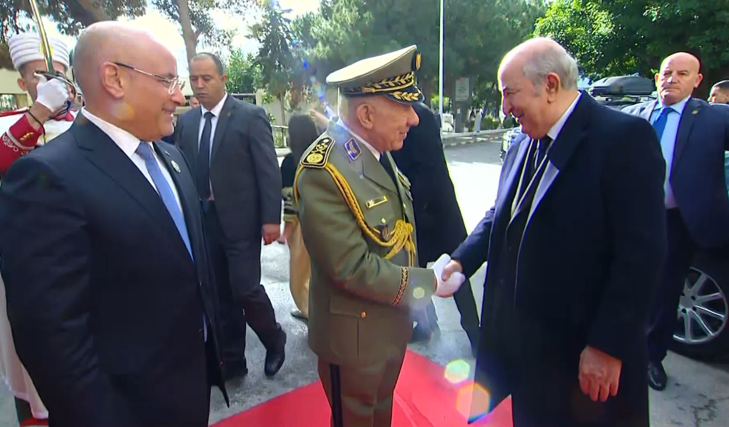Le Président de la République a été accueilli à son arrivée par le Général d’Armée Saïd Chanegriha, Chef d’Etat-major de l’Armée nationale populaire (ANP) et le ministre du Commerce et de la Promotion des exportations, M. Tayeb Zitouni.
