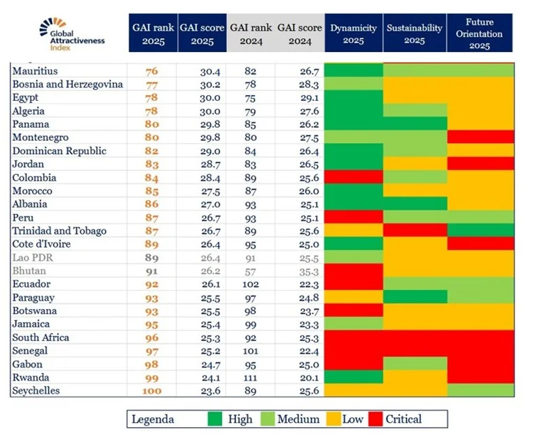 Classée 78e sur 146 économies mondiales, l’Algérie gagne une place par rapport à 2024 (79e) et améliore son score à 30 points contre 27,6 l’an dernier, précise le rapport « Global Attractiveness Index 2025« , publié récemment.