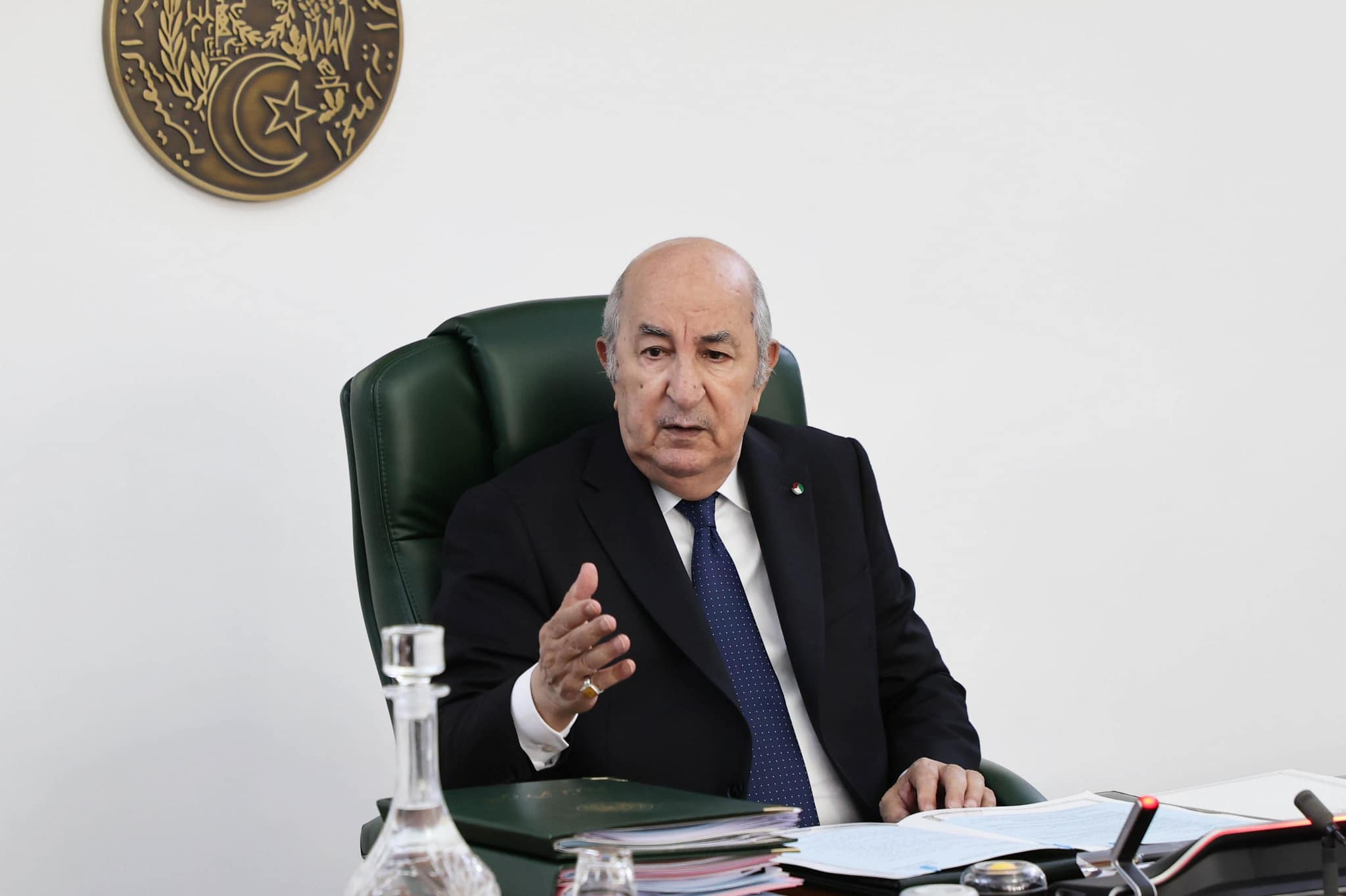 « Monsieur Abdelmadjid Tebboune, président de la République, Chef suprême des Forces armées, ministre de la Défense nationale, a présidé, ce jour, une réunion du Conseil des ministres consacrée au dossier de l’actuelle campagne de moisson-battage, au suivi de la réalisation de silos de stockage de céréales, au plan national des graines oléagineuses et à d’autres exposés, notamment sur le suivi de la réalisation de stations de dessalement de l’eau de mer, la mise en œuvre du programme d’urgence pour le renforcement de l’alimentation en eau potable et les conditions d’accueil de la communauté nationale à l’étranger au niveau des différents postes frontaliers durant la saison estivale.