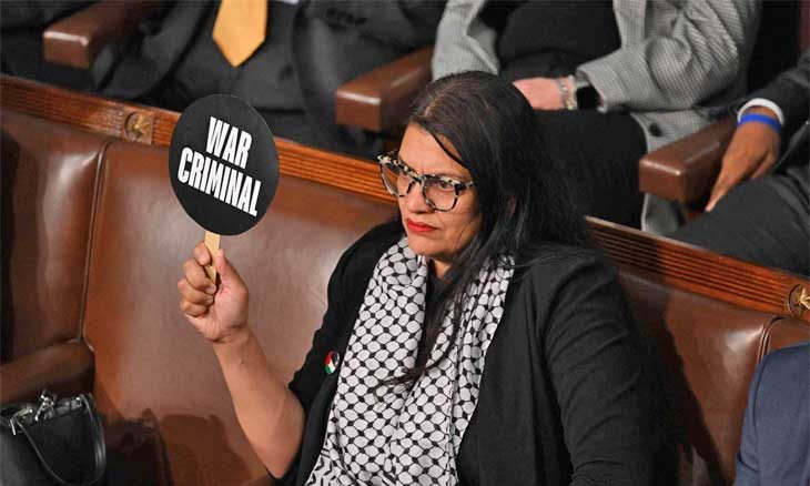 Lors du discours de chef du gouvernement sioniste Netanyahu au Congrès, Rashida Tlaib a brandi une banderole en noir et blanc avec les mots « Criminel de guerre » écrits d’un côté et de l’autre : « Coupable de génocide ».