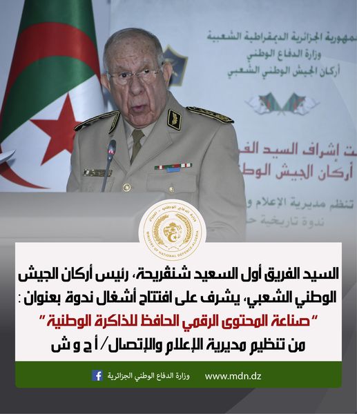 Le général d’armée Said Chanegriha, chef d’état-major de l’Armée nationale populaire (ANP), a procédé, ce lundi, à l’ouverture d’un séminaire intitulé « Création d’un contenu numérique pour préserver la mémoire nationale ».