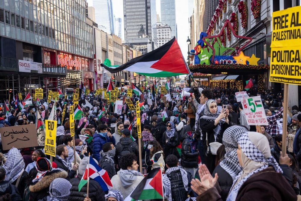A New York, des milliers de personnes ont également défilé en solidarité avec les Palestiniens dans le célèbre quartier de Times Square, certaines portant des photos de personnes assassinées lors de l’agression sioniste à