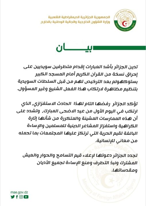 L’Algérie a « fermement » condamné les actes d’extrémistes suédois ayant brûlé un exemplaire du Saint Coran devant la Grande Mosquée de Stockholm, après avoir reçu l’autorisation des autorités suédoises d’organiser une manifestation pour commettre cet acte odieux et irresponsable, a indiqué jeudi un communiqué du ministère des Affaires étrangères et de la Communauté nationale à l’étranger.