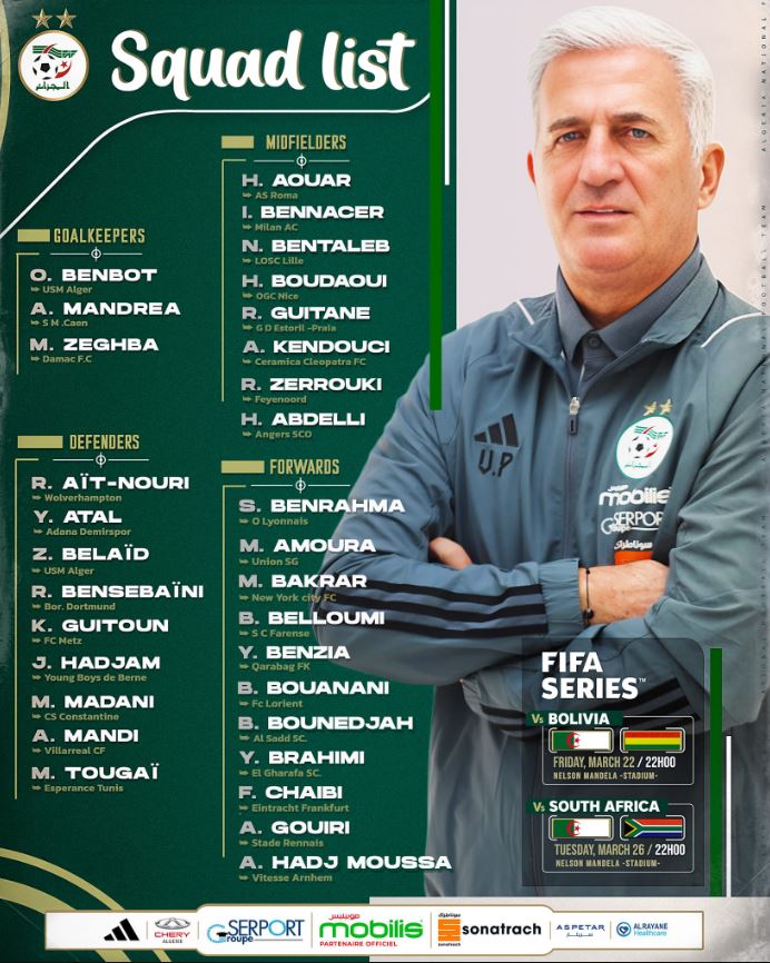 La première liste du sélectionneur national est marquée par l’absence du capitaine des Verts Riyad Mahrez (Al-Ahy-Arabie saoudite) ainsi que le retour de plusieurs joueurs entre autres, le milieu offensif Yacine Brahimi (El Gharafa SC/Qatar), Said Benrahma (Olympique lyonnais/ France), Yacine Benzia (Qarabag FK/ Azerbaïdjan) Jouen Hadjam (Young Boys de Berne/Suisse), Bachir Belloumi (SC Farense/ Portugal) et Badredine Bouanani (FC Lorient/ France).
