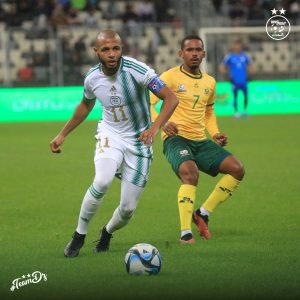 En seconde période, le capitaine algérien Brahimi a égalisé (52e), mais Rayners a redonné l’avantage aux Sud-Africains (65e). Benzia a récidivé pour remettre les pendules à l’heure et signer le doublé (70e).