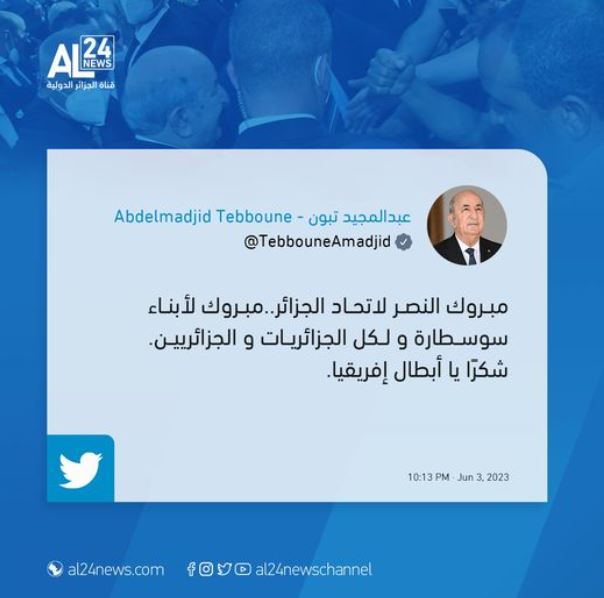 .Félicitations aux enfants de Soustara et à toutes les Algériennes et à tous les Algériens..Merci les champions d’Afrique », a écrit le Président Tebboune sur son compte Twitter.