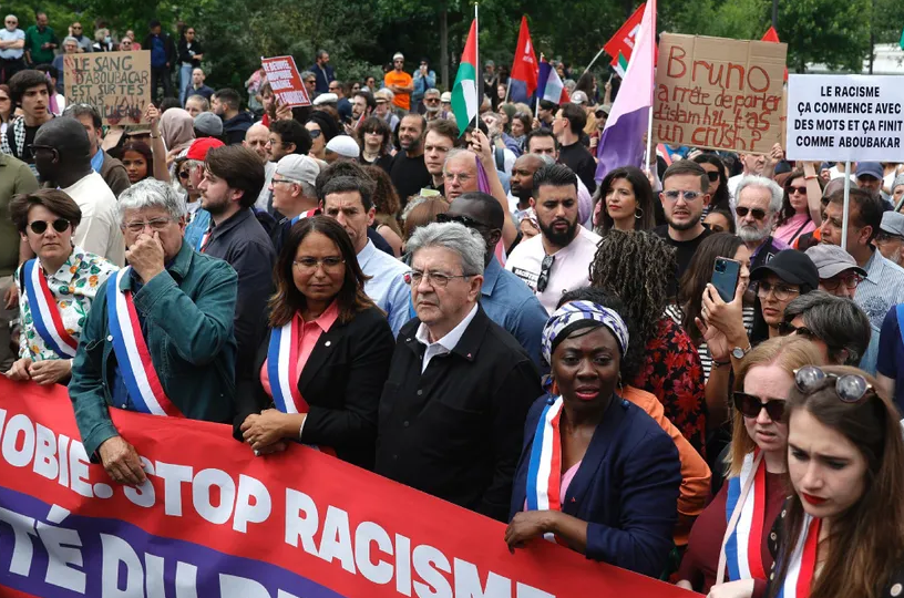 « Le racisme, ça commence avec des mots et ça finit comme Aboubakar », clame une pancarte visible dans le cortège où ont pris place de nombreux représentants de la France Insoumise, dont Jean-Luc Mélenchon, Louis Boyard ou Eric Coquerel.