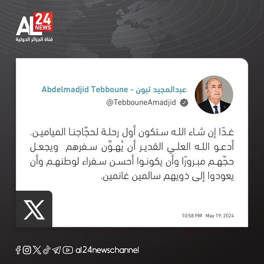 « Demain, si Dieu le veut, aura lieu le premier vol de nos pèlerins. Je prie Dieu le Tout Puissant de faciliter le voyage, que votre Hadj soit accepté. Soyez les meilleurs ambassadeurs de votre pays et bon retour à tous sains et saufs », a écrit le Président de la République sur son compte officiel dans les réseaux sociaux.