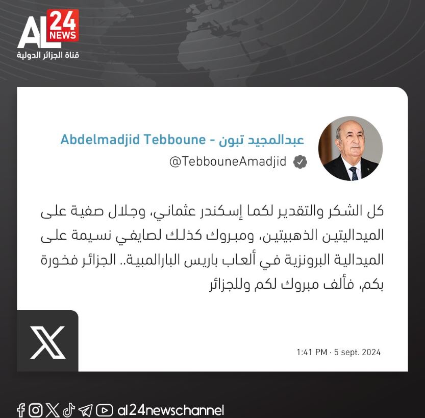 L’Algérie est fière de vous. Bravo à vous et à l’Algérie », a écrit le président de la République dans son message de félicitations sur son compte officiel sur les réseaux sociaux.