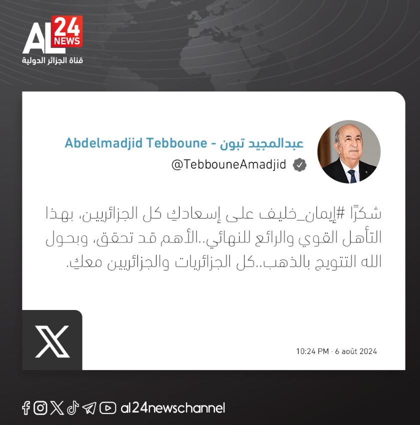 « Merci Imane Khelif d’avoir fait le bonheur de tous les Algériens, avec cette brillante et merveilleuse qualification pour la finale..Le plus important a été réalisé, et décrocher l’or si Dieu le veut. Toutes les Algériennes et tous les Algériens sont avec toi », a écrit le président de la République dans son message de félicitations.