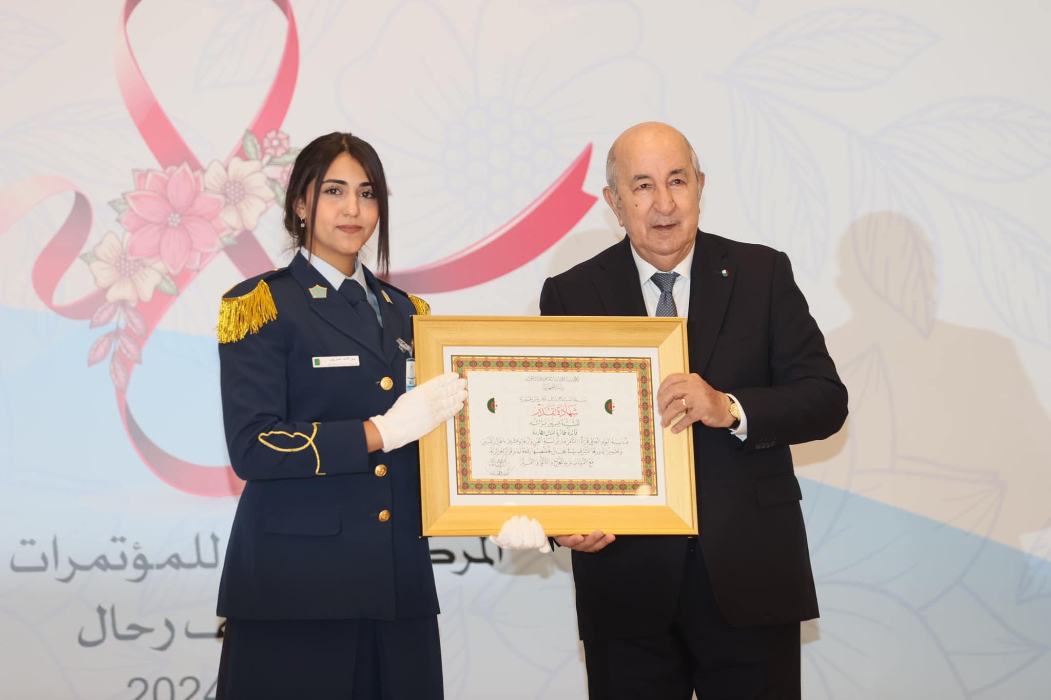 Le président de la République a remis des attestations de reconnaissance à Mesdames Nihad Bouslama Maamcha (professeur en écologie et environnement), Ziani Rekioua Djamila (professeur en énergies renouvelables), Khalil Amel (professeur en dermatologie), Syrine Berrached (pilote d’avion de chasse), Fatma Hamdi (activiste dans le secteur Agricole), Fella Zenati (ingénieure en mines et chercheuse en énergies renouvelables), Othmani Fatma (artisane dans l’industrie du cuir) et Nesrine Ziad (entrepreneure et cheffe d’entreprise).