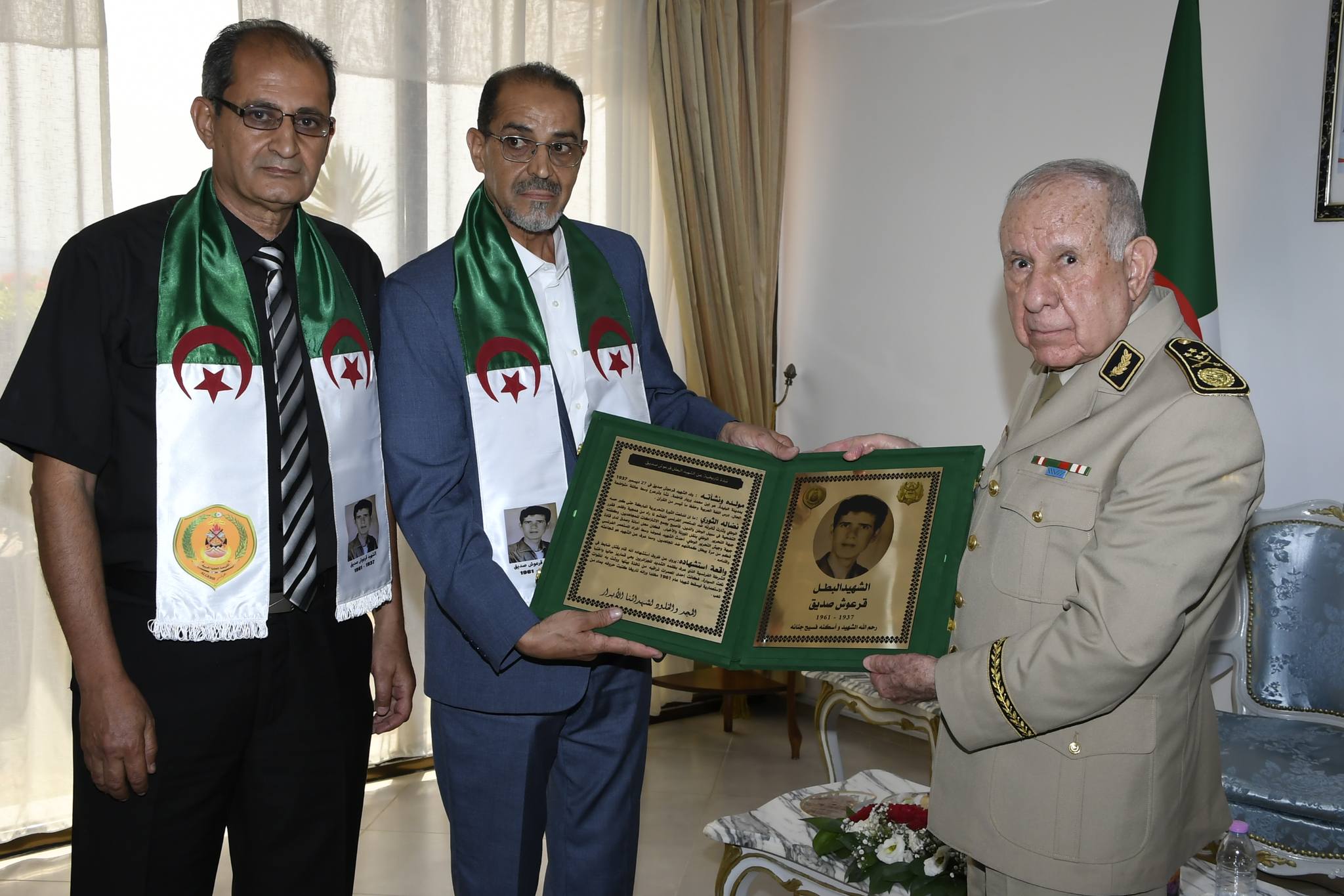 « Après la cérémonie d’accueil, et à l’entrée de l’Ecole supérieure de guerre, le Général d’Armée, accompagné du Général-major Ali Sidane, Commandant de la 1ère Région militaire et du Général-major Hamid Fekane, directeur de l’Ecole, a observé un moment de recueillement à la mémoire du défunt Président Ali Kafi, dont le siège de l’Ecole est baptisé en son nom, et a déposé une gerbe de fleurs devant la stèle commémorative, avant de