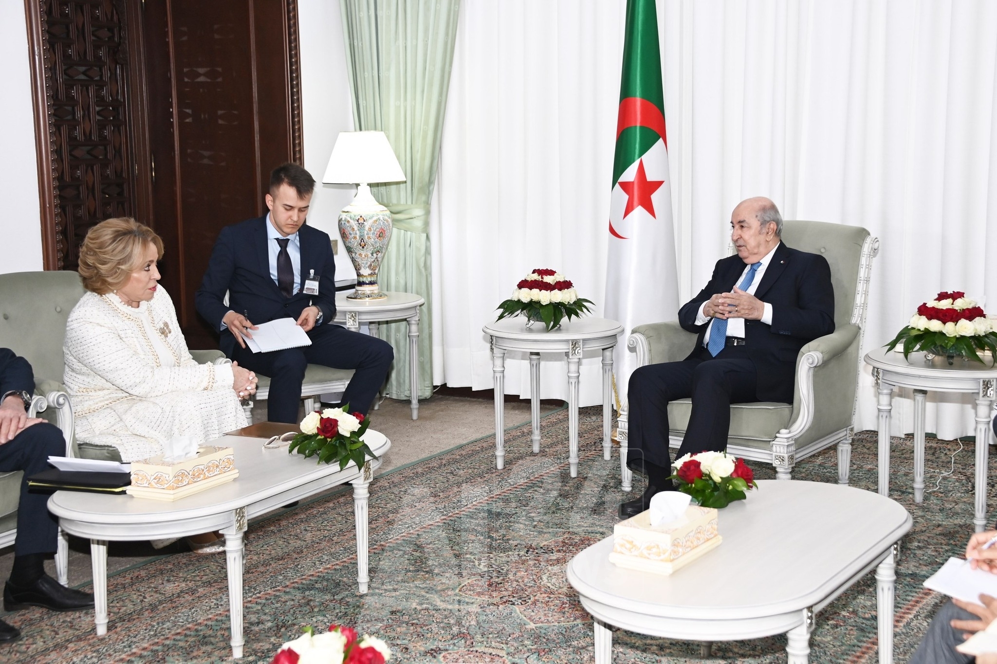 L’audience s’est déroulée au siège de la présidence de la République, en présence du président du Conseil de la nation, M. Salah Goudjil, du directeur de cabinet à la présidence de la République, M. Abdelaziz Khellaf, du secrétaire général du ministère des Affaires étrangères et de la Communauté nationale à l’étranger, M. Amar Belani, du coté algérien et de l’ambassadeur de la Fédération de Russie à Alger, M. Valerian Shuvaev, du coté russe, souligne le communiqué.