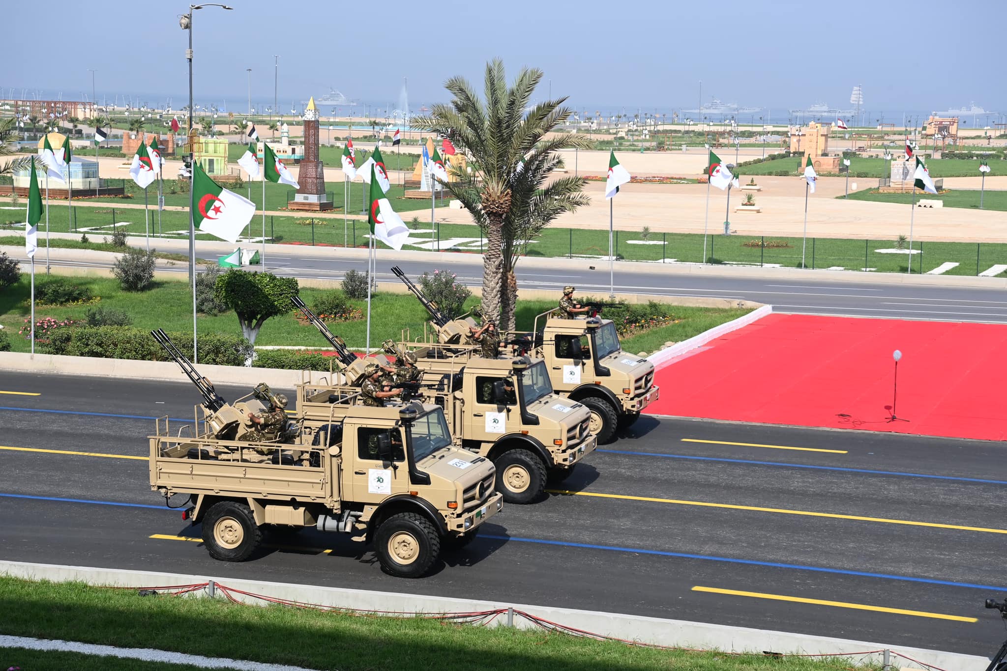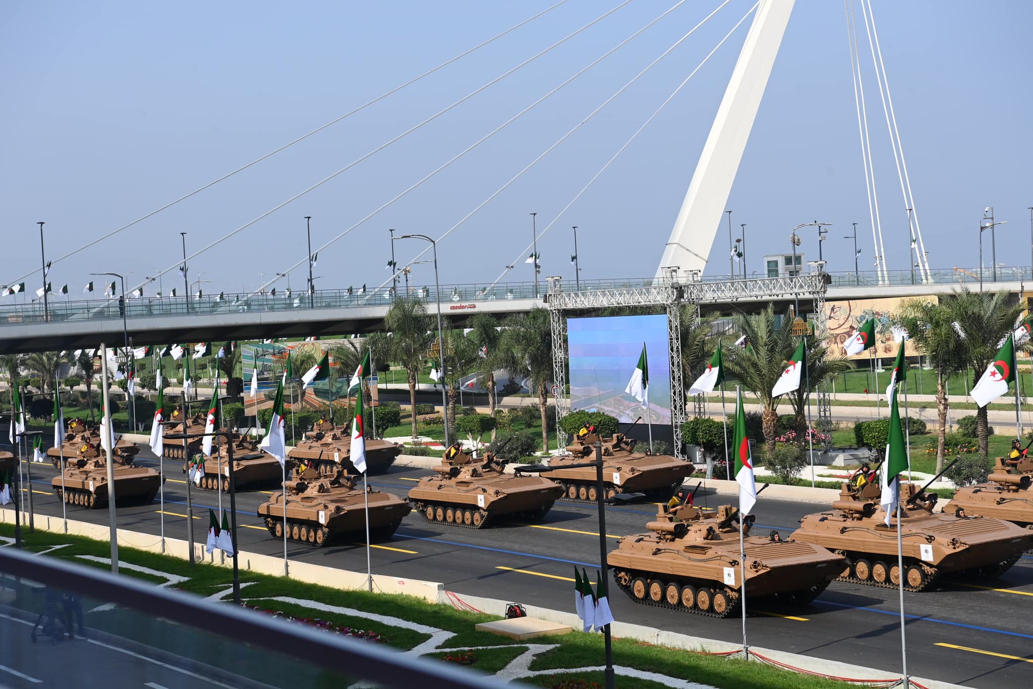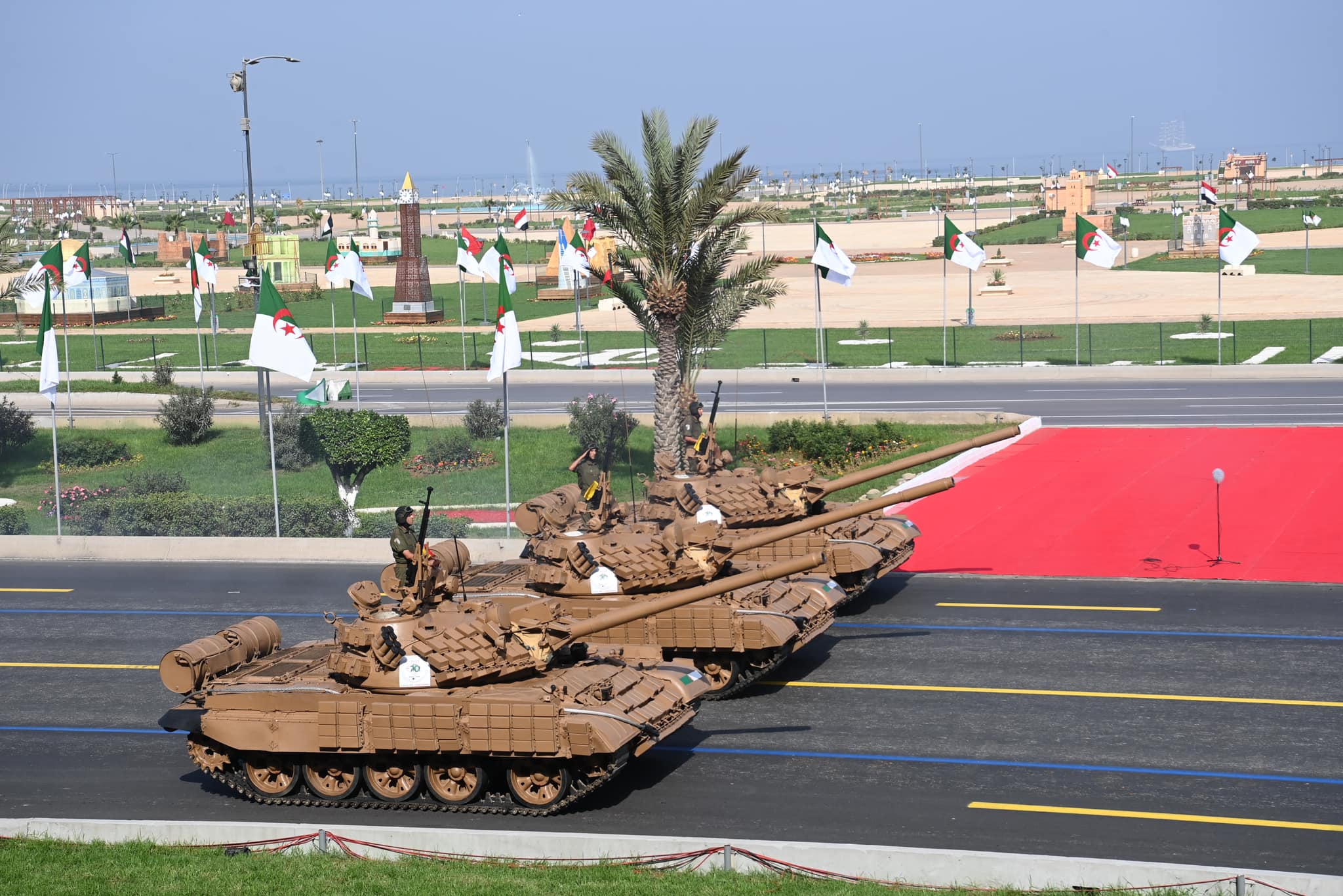 Au terme de son allocution, le Président de la République, Chef Suprême des Forces Armées, Ministre de la Défense Nationale a annoncé, ajoute d’autre part le communiqué du MDN, le lancement officiel de ce défilé militaire, débutant par les carrés de la fanfare et de la Cavalerie, relevant de la Garde Républicaine, suivis des carrés des Moudjahidine, des Cadets de la Nation, des Commandements de Forces, des Ecoles militaires, ainsi que les carrés de la Direction Générale de la Sûreté Nationale, de la Direction Générale de la Protection Civile et de la Direction Générale des Douanes, avant de laisser place aux formations de véhicules de combat, à leur tête, les différents types de Chars, les véhicules de l’Infanterie mécanisée et motorisée, de l’artillerie, les divers types de véhicules lance-roquettes, divers systèmes d’artillerie contre aéronefs et les systèmes de missiles de défense aérienne avancés, les divers systèmes de radar, des véhicules blindés légers, des véhicules de reconnaissance et d’assaut.