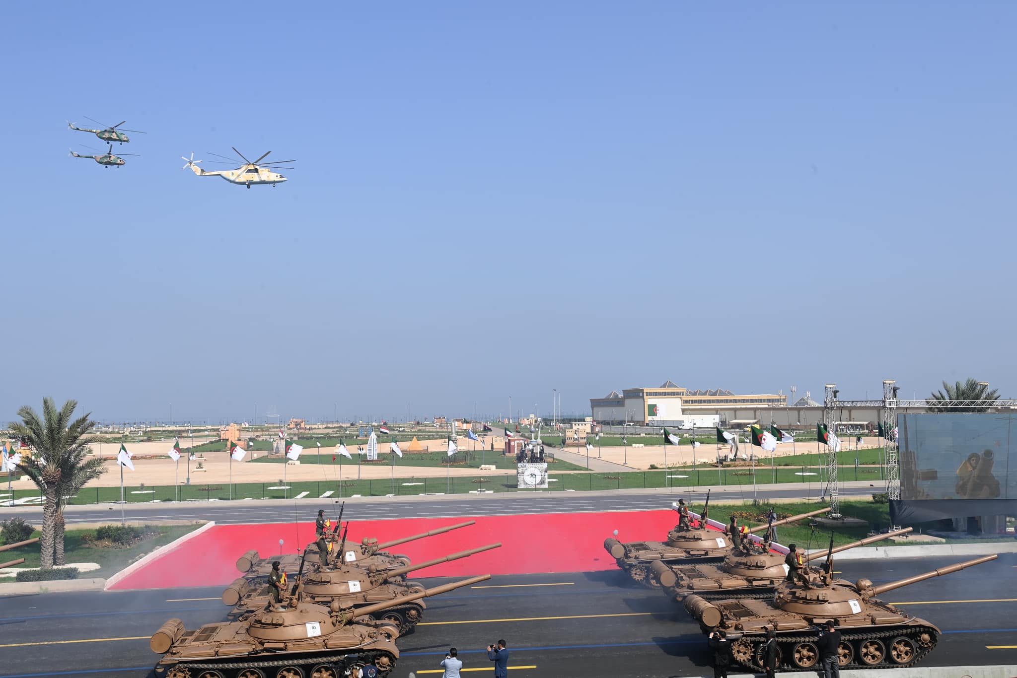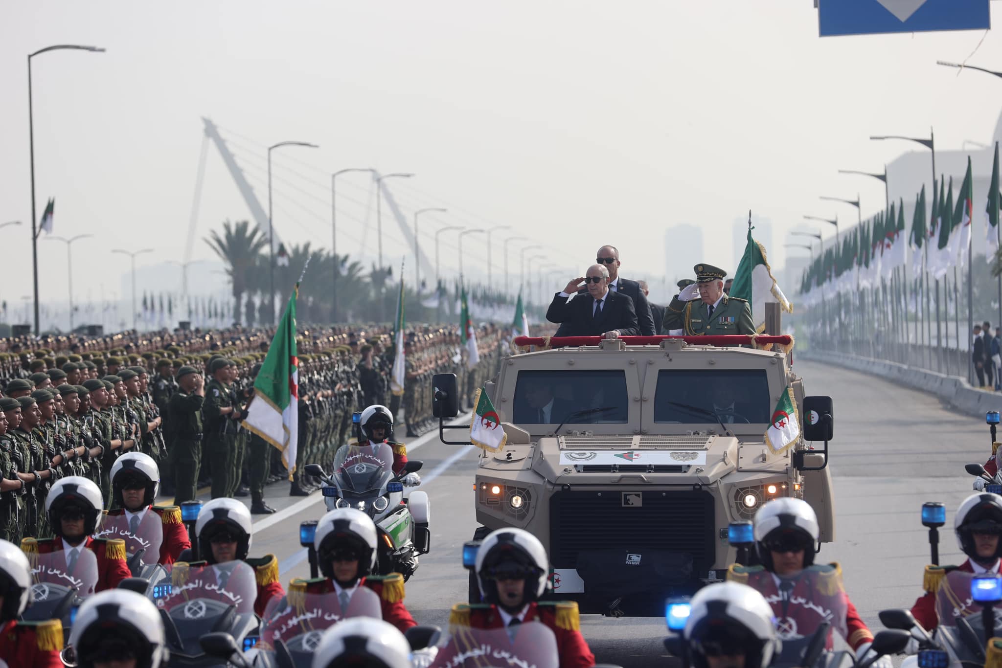 La même source précise que »ce défilé militaire s’est tenu également en présence de le Général d’Armée, Saïd Chanegriha, Chef d’Etat-Major de l’Armée Nationale Populaire, du président du Conseil de la Nation, du président de l’Assemblée Populaire Nationale, du Président de la Cour Constitutionnelle, du Premier ministre, des membres du Gouvernement, du Commandant de la Garde Républicaine, des Commandants de Forces, de la Gendarmerie Nationale, des Commandants des Régions Militaires et de Généraux-major et Généraux de l’Armée Nationale Populaire, aux côtés de hauts responsables de l’Etat, de représentants de la famille révolutionnaire, des responsables des organes médiatiques et de la famille universitaire, ainsi que des représentants du corps diplomatique et des attachés de défense accrédités en Algérie.