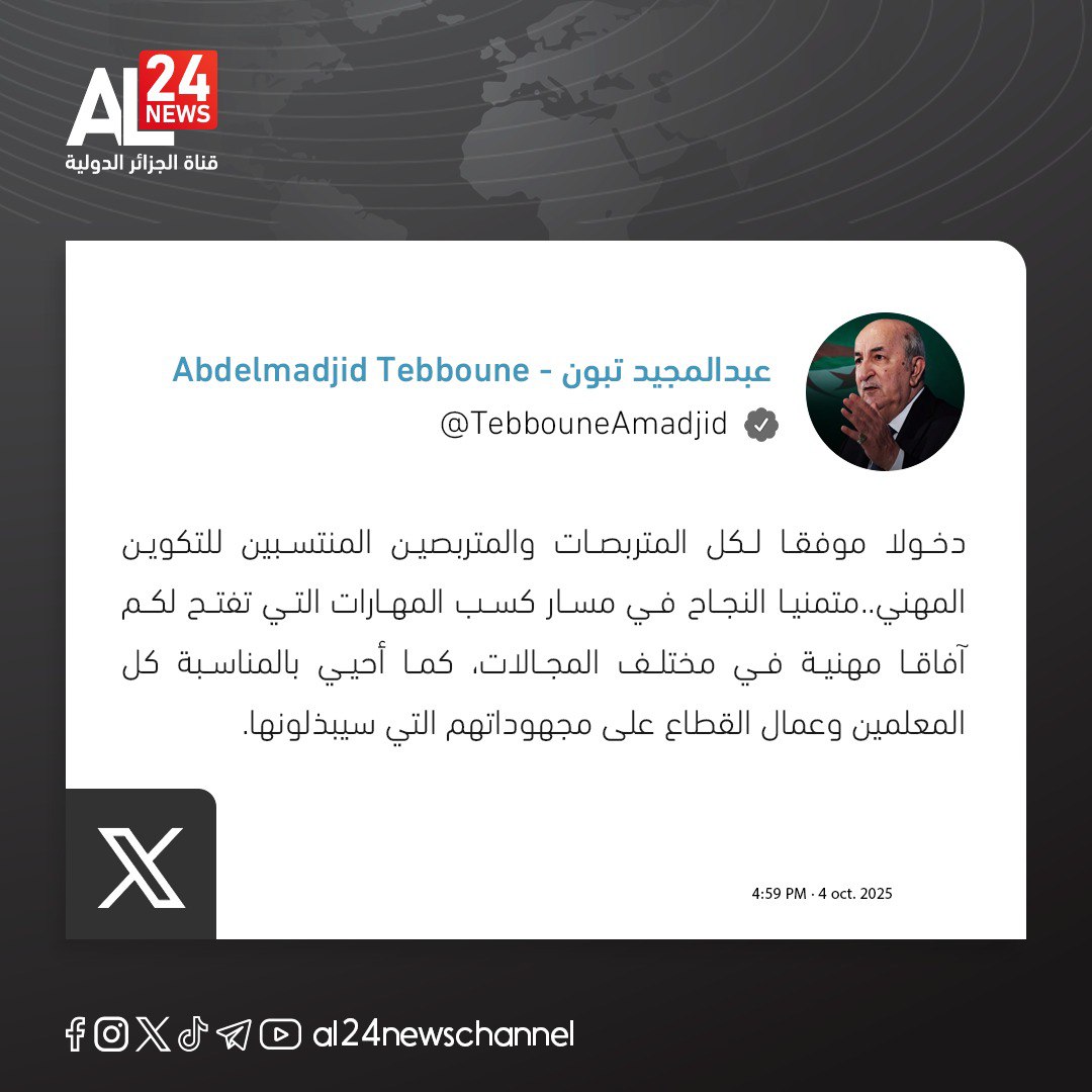 Le président Tebboune adresse ses vœux à la communauté de la formation et de l’enseignement professionnels à l’occasion de la rentrée professionnelle