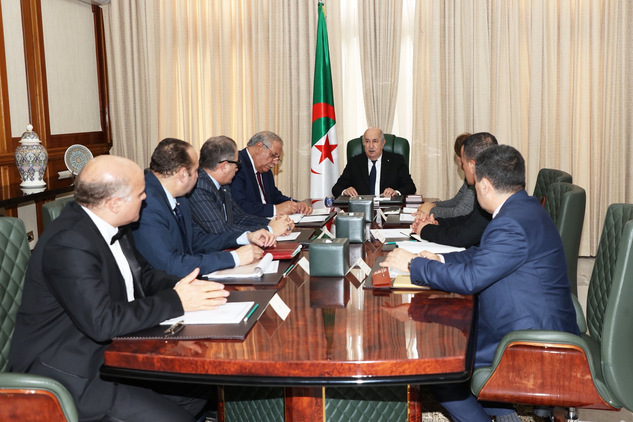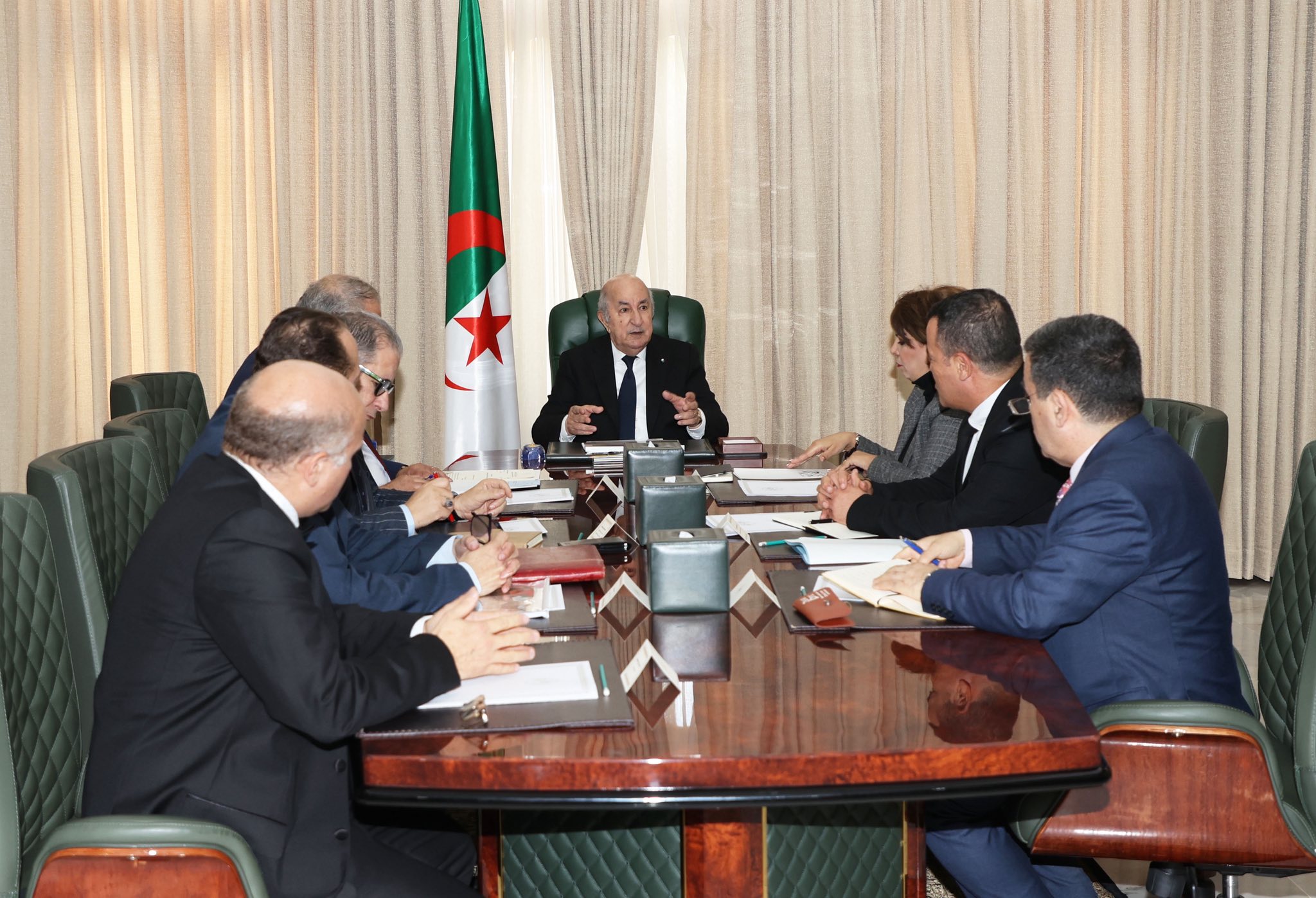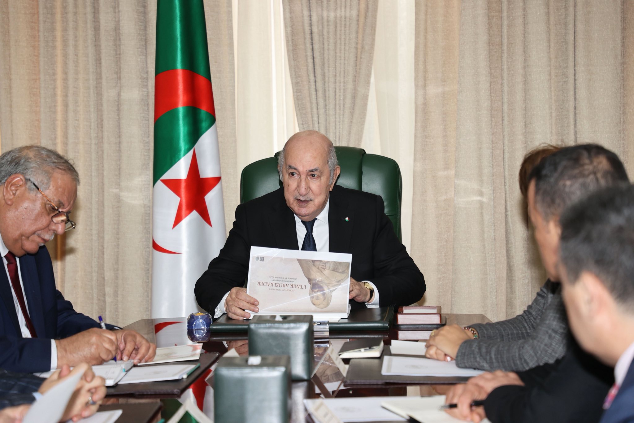 La réunion s’est déroulée en présence du directeur de Cabinet à la présidence de la République, Boualem Boualem, du conseiller du président de la République chargé de la Direction générale de la communication, Kamel Sidi Said, de la ministre de la Culture et des Arts, Malika Bendouda, du chargé de mission à la Présidence de la République pour le secteur du cinéma, Fayçal Metaoui, du conseiller auprès de la ministre de la Culture et des Arts, Abdelkader Boudjemaa, du directeur de la Fondation Emir Abdelkader, Salim Aggar, et du producteur et réalisateur Anouar Hadj Ismail.