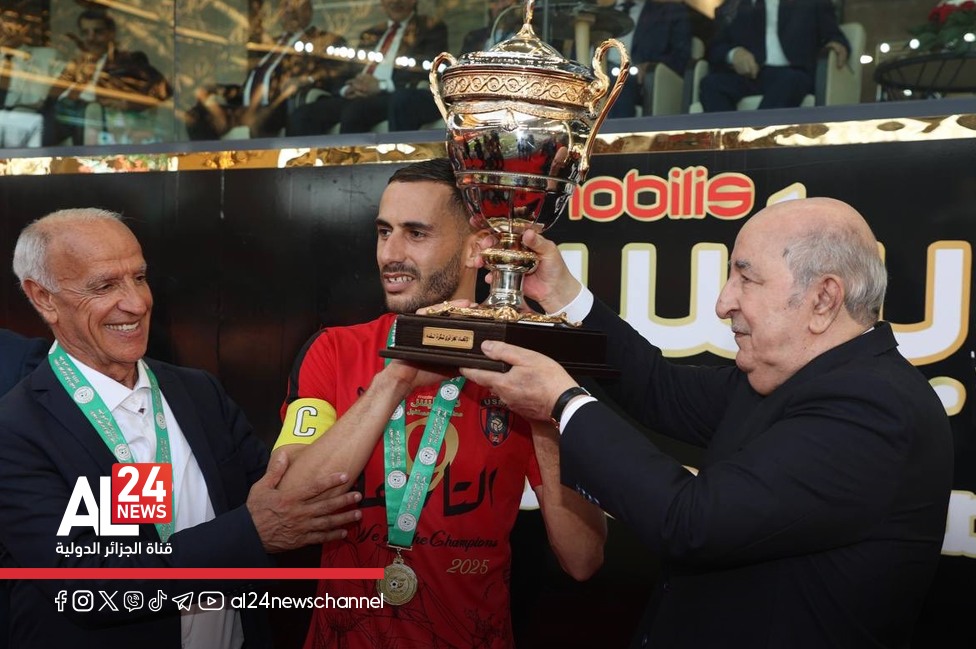 Le président de la République, Abdelmadjid Tebboune, a remis, samedi soir, le trophée de la Coupe d’Algérie de football au capitaine de l’USM Alger, Saadi Redouani, à l’issue de la finale remportée devant le CR Belouizdad (2-0), au stade Nelson-Mandela de Baraki (Alger).