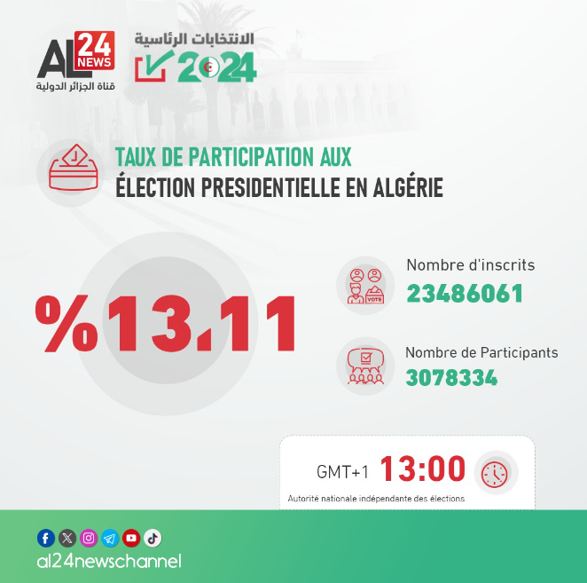 Le taux de participation national à l’élection présidentielle qui se déroule samedi au niveau national s’est établit à 13,11 % à 13 heures, a annoncé le président de l’Autorité nationale indépendante des élections (ANIE), Mohamed Chorfi.