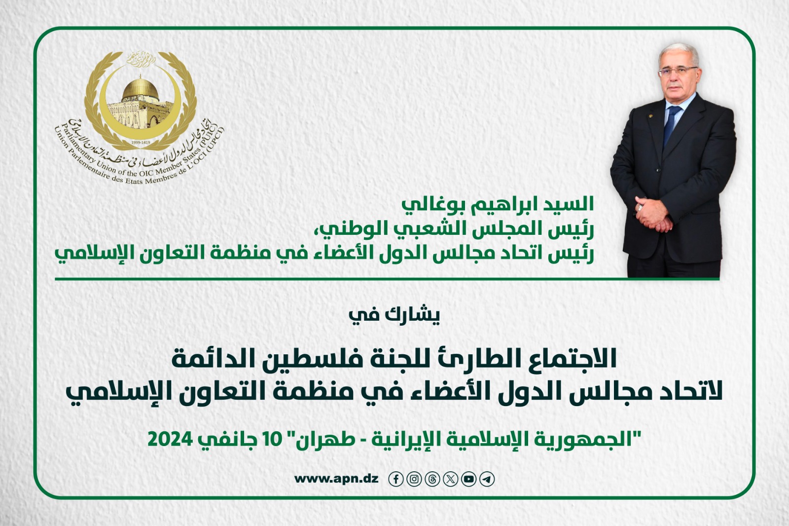 Le président de l’Assemblée populaire nationale (APN), président de l’Union parlementaire des Etats membres de l’Organisation de la coopération islamique (UPCI), Brahim Boughali, participera à la Réunion d’urgence du Comité de la Palestine de l’UPCI, prévue mercredi à Téhéran (Iran), a indiqué un communiqué de la chambre basse du Parlement.
