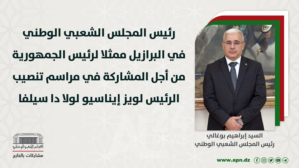 « Chargé par le président algérien, M. Abdelmadjid Tebboune, le président de l’APN, M. Brahim Boughali prendra part, dimanche, le 1er janvier 2023 à Brasilia, à la cérémonie d’investiture du nouveau président brésilien, Luiz Inacio Lula Da Silva », note la même source.