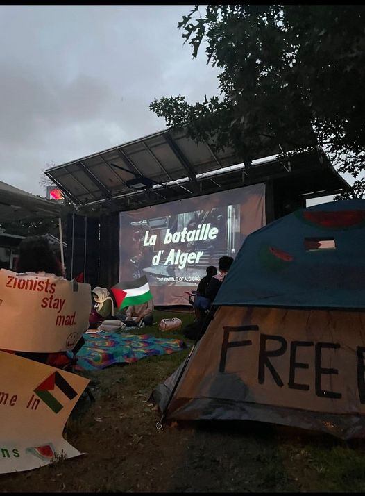 Des images postées en ligne ont montré des scènes de projection nocturne hier du film de Gillo Pontecorvo, sorti en 1966, en milieu des camps de sit-in de protestation des étudiants de la prestigieuse université américaines de Stanford.