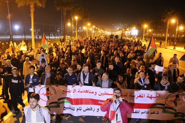 Dans le cad re de cet appel, les sections locales du Front ont commencé à annoncer des sit-in et des marches de protestation, notamment à Casablanca, Marrakech et Tanger, sous le slogan : « Une seule marche pour faire tomber la normalisation et soutenir la lutte du peuple palestinien ». Le Front a déclaré que la normalisation des relations avec l’entité sioniste constitue une trahison de la cause palestinienne, accusant l’Etat d’avoir franchi toutes les lignes rouges sans tenir compte de l’opposition populaire. Il a dénoncé le recours à la répression des voix libres, avec l’arrestation récente de nombreux militants pro-palestiniens accusés à tort, dans le but de faire taire leur opposition.