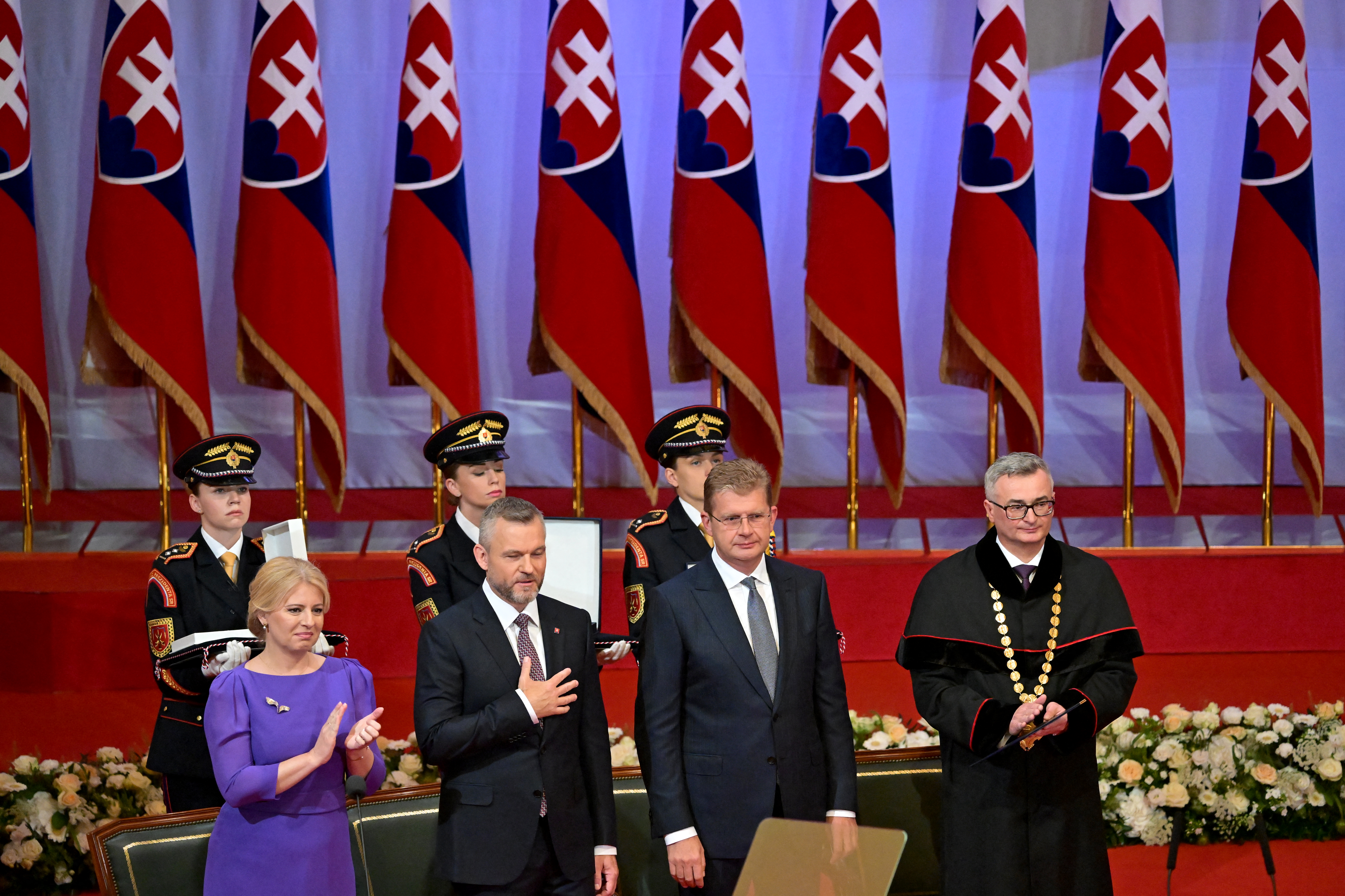 Outgoing Slovak President Zuzana Caputova (L) applauds after Peter Pellegrini (2nd L) was sworn in as her successor during a ceremonial parliamentary meeting and inauguration event for Slovakia's new president on June 15, 2024 at the Reduta Palace in Bratislava, Slovakia; at (L) is the President of the Constitutional Court of Slovakia Ivan Fiacan, at (2nd L) the acting speaker of the National Council of the Slovak Republic Peter Ziga. - Peter Pellegrini on April 6, 2024 won a presidential election in the EU and NATO member of 5.4 million people, after divisions over the Ukraine war dominated the vote. Pellegrini is a longtime ally of Prime Minister Robert Fico, who has questioned Ukraine's sovereignty and discontinued military aid to Ukraine since taking office in October 2023. (Photo by Joe Klamar / AFP)
