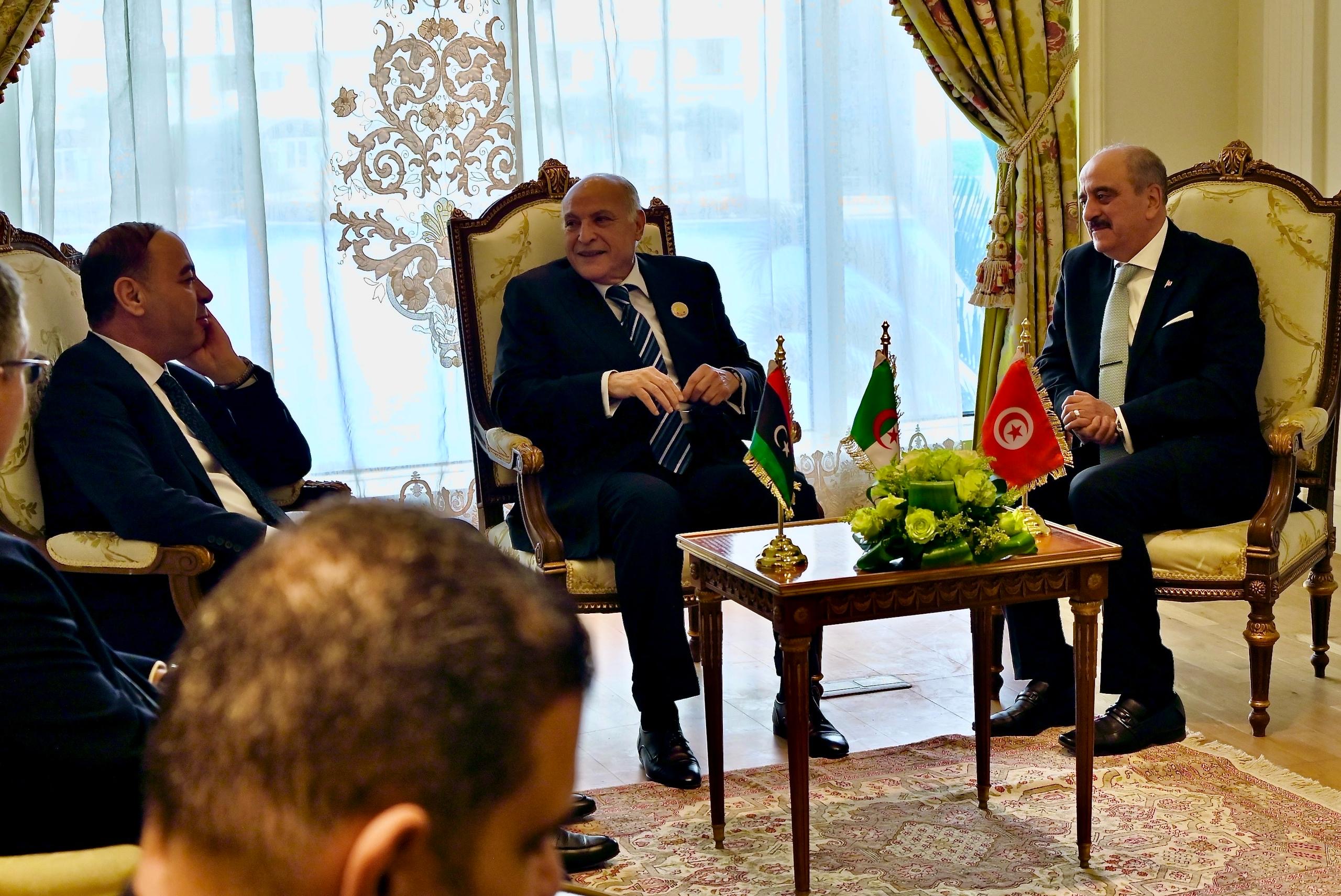 Une réunion tripartite Algérie-Tunisie-Libye s’est tenue entre le ministre d’Etat, ministre des Affaires étrangères, de la Communauté nationale à l’étranger et des Affaires africaines, Ahmed Attaf, le ministre des Affaires étrangères, de la Migration et des Tunisiens à l’étranger de la République tunisienne, pays frère, Mohamed Ali Nafti, et le Chargé de la gestion du ministère des Affaires étrangères de l’Etat de Libye, Taher Al-Baour, peu avant l’ouverture des travaux du Sommet arabe extraordinaire au Caire, indique, mardi, un communiqué du ministère.