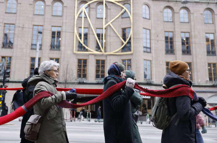 Plusieurs centaines de femmes ont entouré le Parlement suédois d’une longue écharpe rouge tricotée à la main, dimanche, pour protester contre l’inaction des responsables politiques face au réchauffement climatique, ont rapporté des médias.