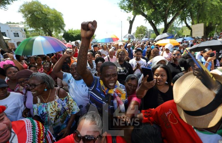 Entre 1.000 et 2.000 personnes se sont réunies en fin de matinée pour protester contre les hausses de prix des produits alimentaires, de l’essence et de l’électricité, accusant le gouvernement et le président Chan Santokhi de corruption.