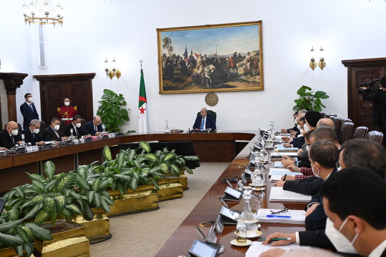 « Monsieur Abdelmadjid Tebboune, Président de la République, Chef suprême des Forces armées, ministre de la Défense nationale, a présidé, ce jour, une réunion du Conseil des ministres consacrée à deux projets de loi, le premier relatif à la prévention et à la répression de l’usage et du trafic illicites de stupéfiants et de substances psychotropes et le deuxième fixant les conditions et les modalités d’octroi du foncier économique relevant du domaine privé de l’Etat et destiné à la réalisation de projets d’investissement, ainsi qu’à un exposé sur les mesures pratiques pour limiter le phénomène d’asphyxie par gaz brûlés (monoxyde de carbone) dans les foyers.
